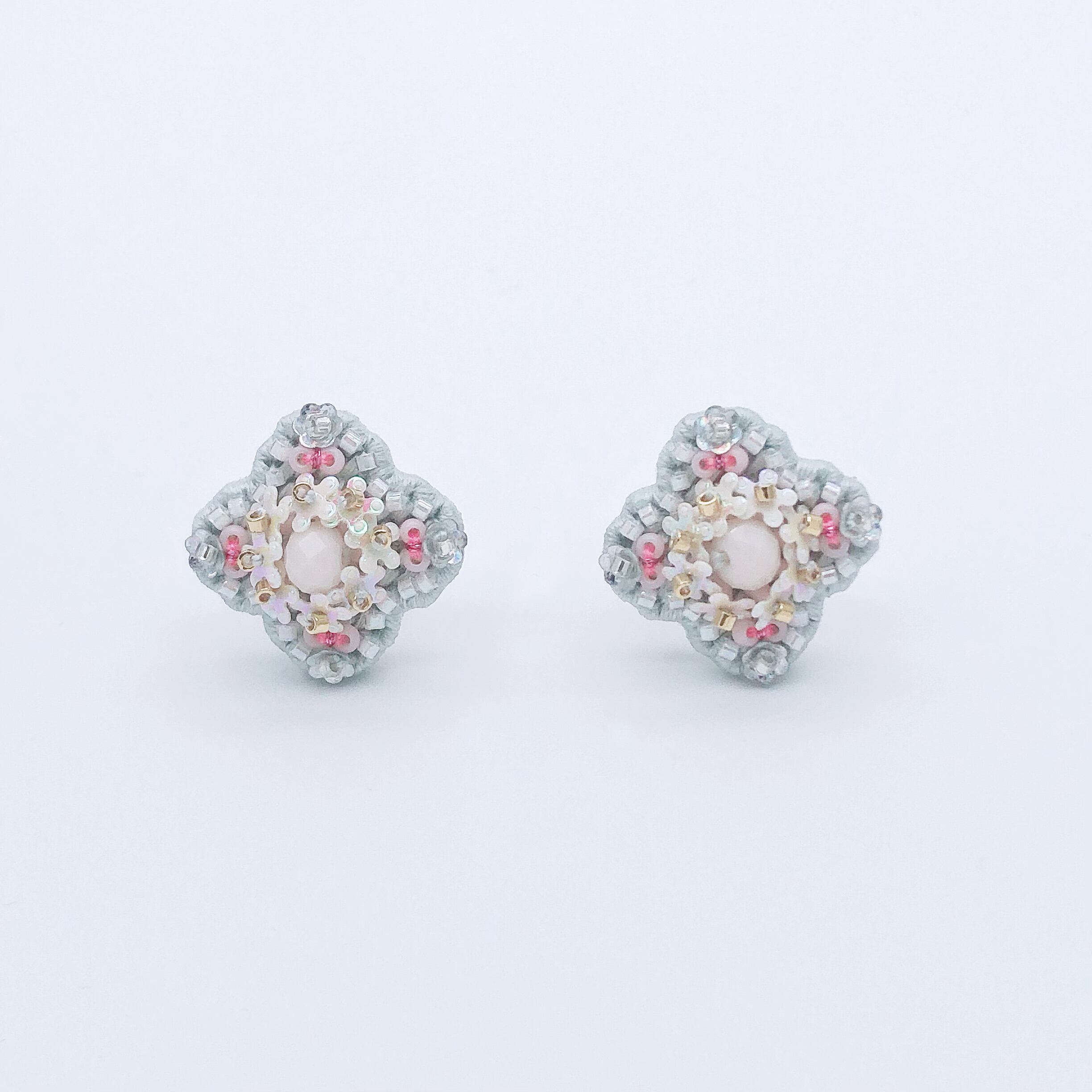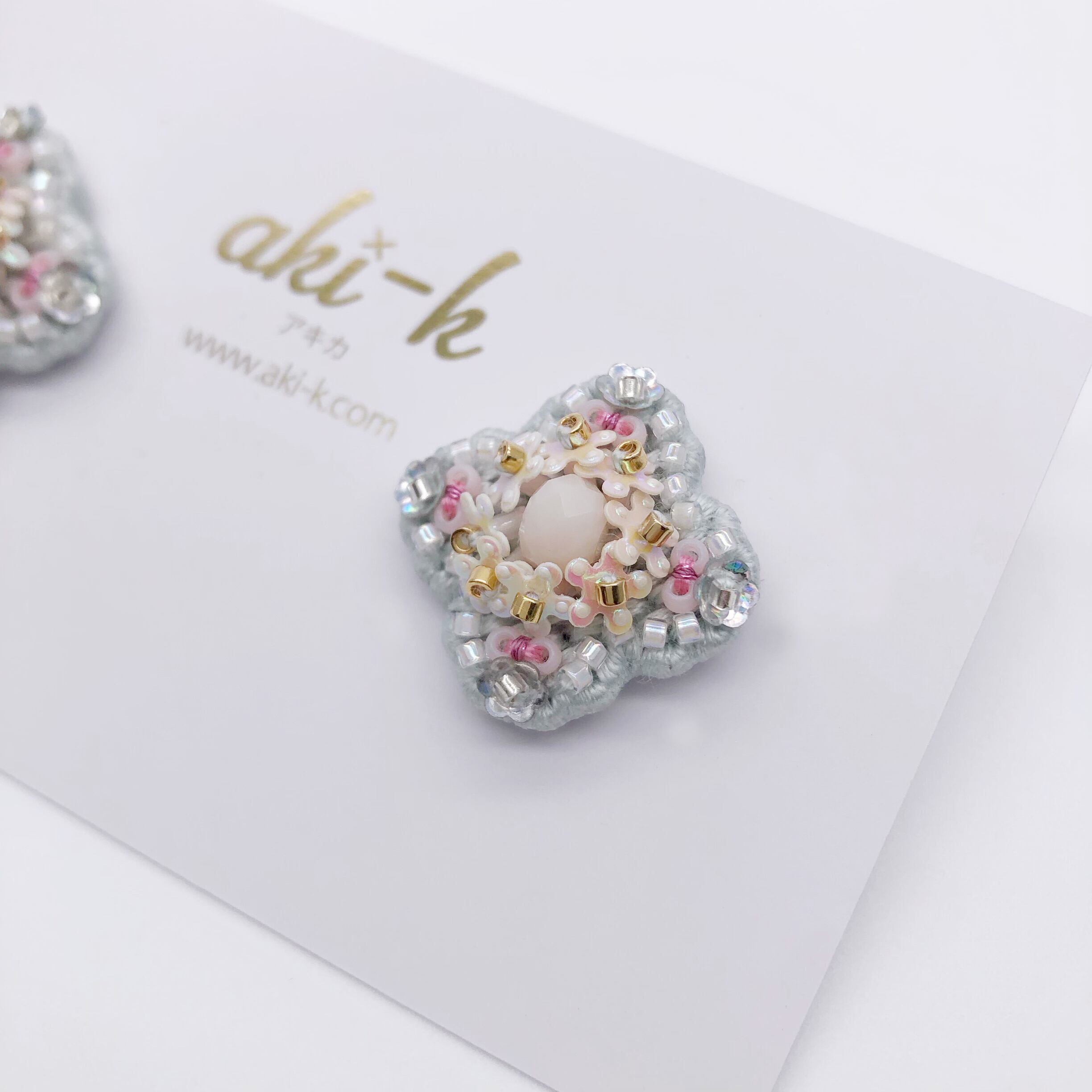 素材:ピアス金具(真鍮)、刺繍糸、プラスチック板(芯)、ガラスビーズ、スパンコール