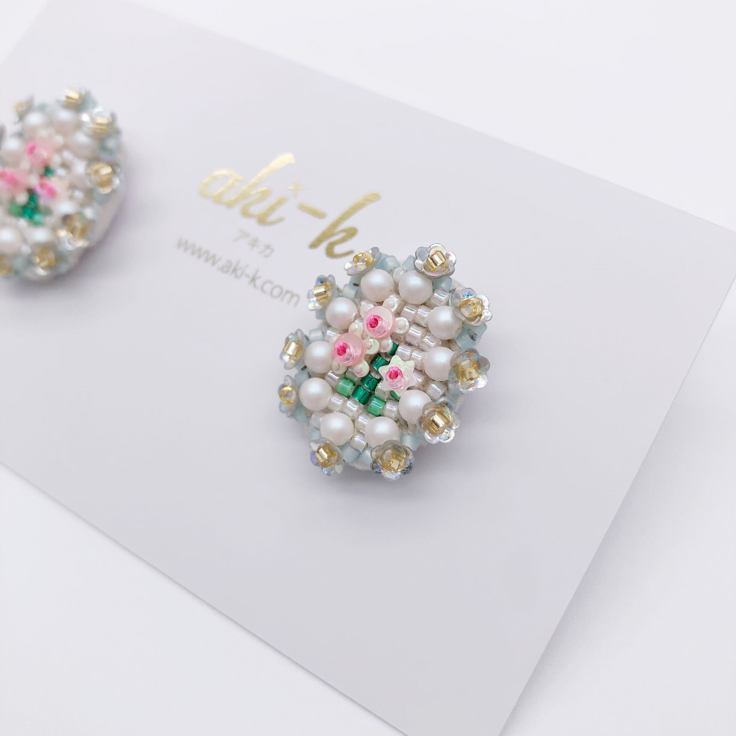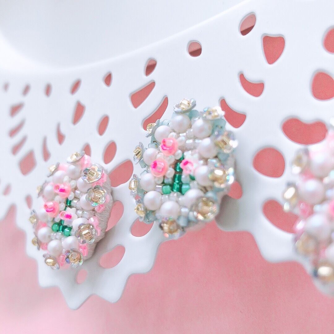 素材:ピアス、イヤリング(真鍮)キャッチ(PS樹脂、真鍮、シリコン)、刺繡糸、ガラスビーズ、スパンコール