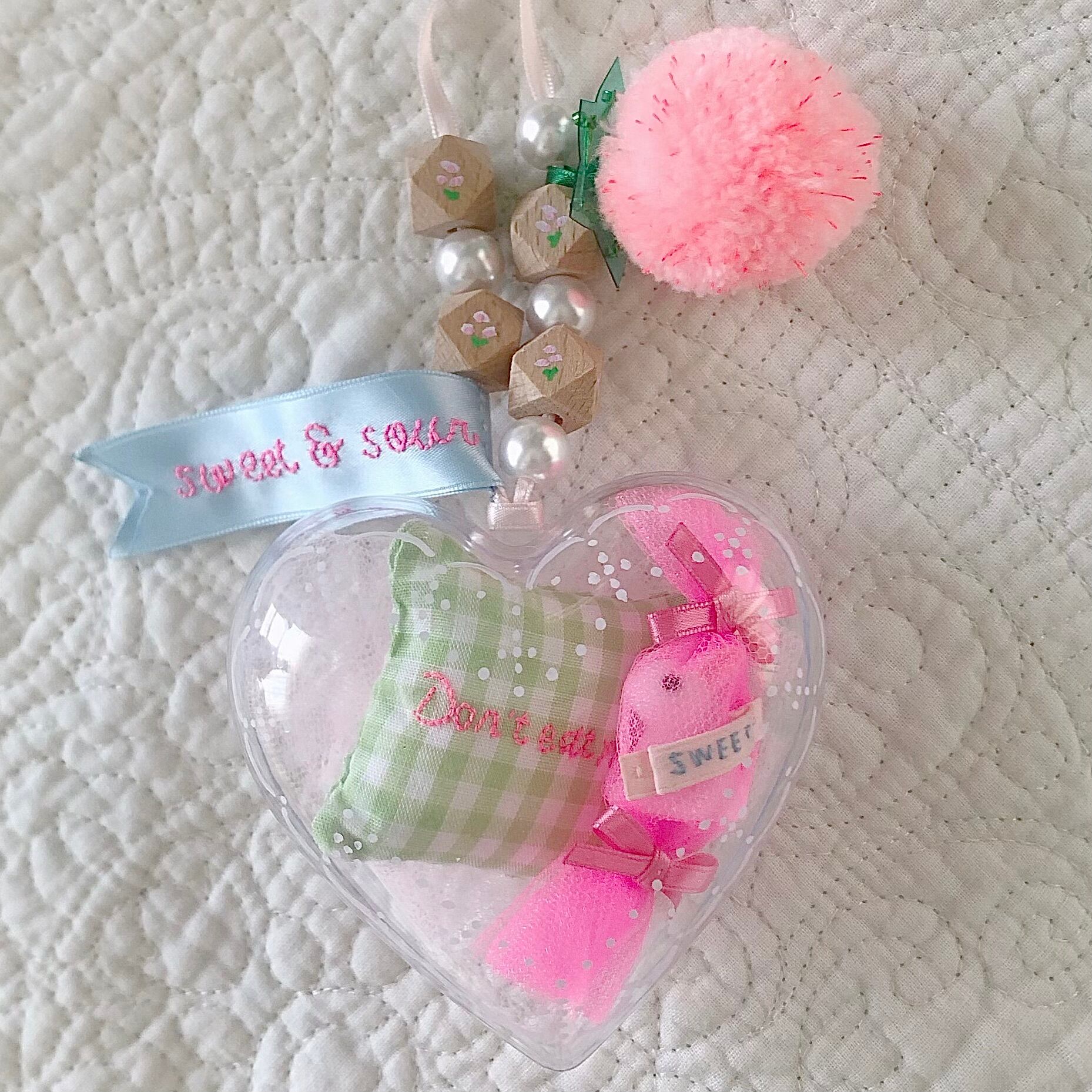 ウッドビーズにお花を、ハートのケースにはレースの模様をペイントしています。