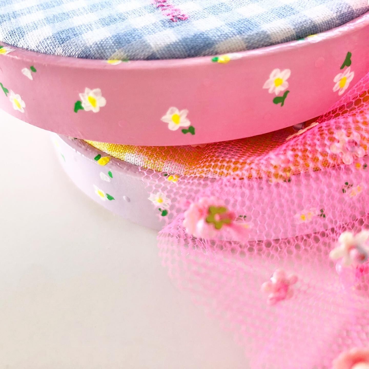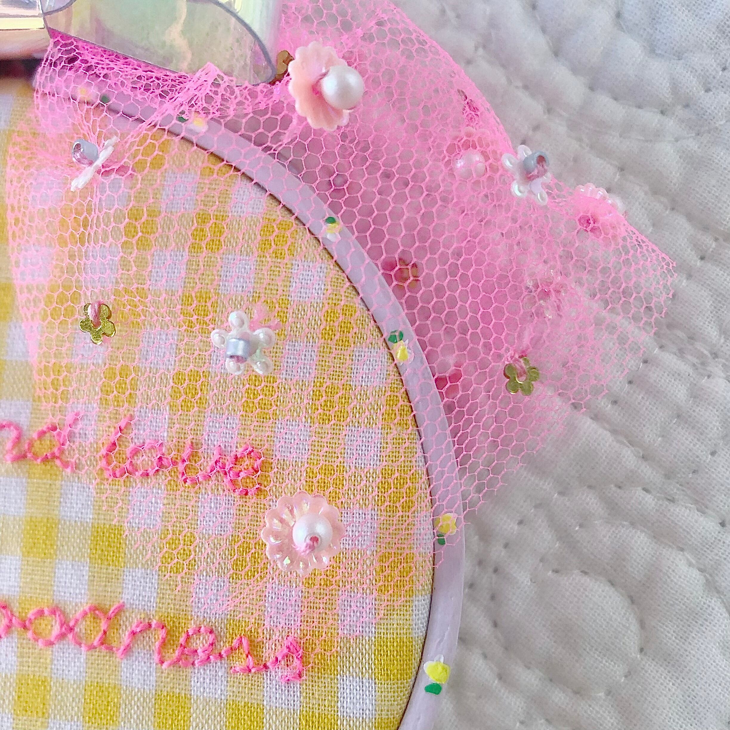 刺繍枠には苺の花をペイントし、オーロラのリボンとピンクのチュールで華やかに仕上げています