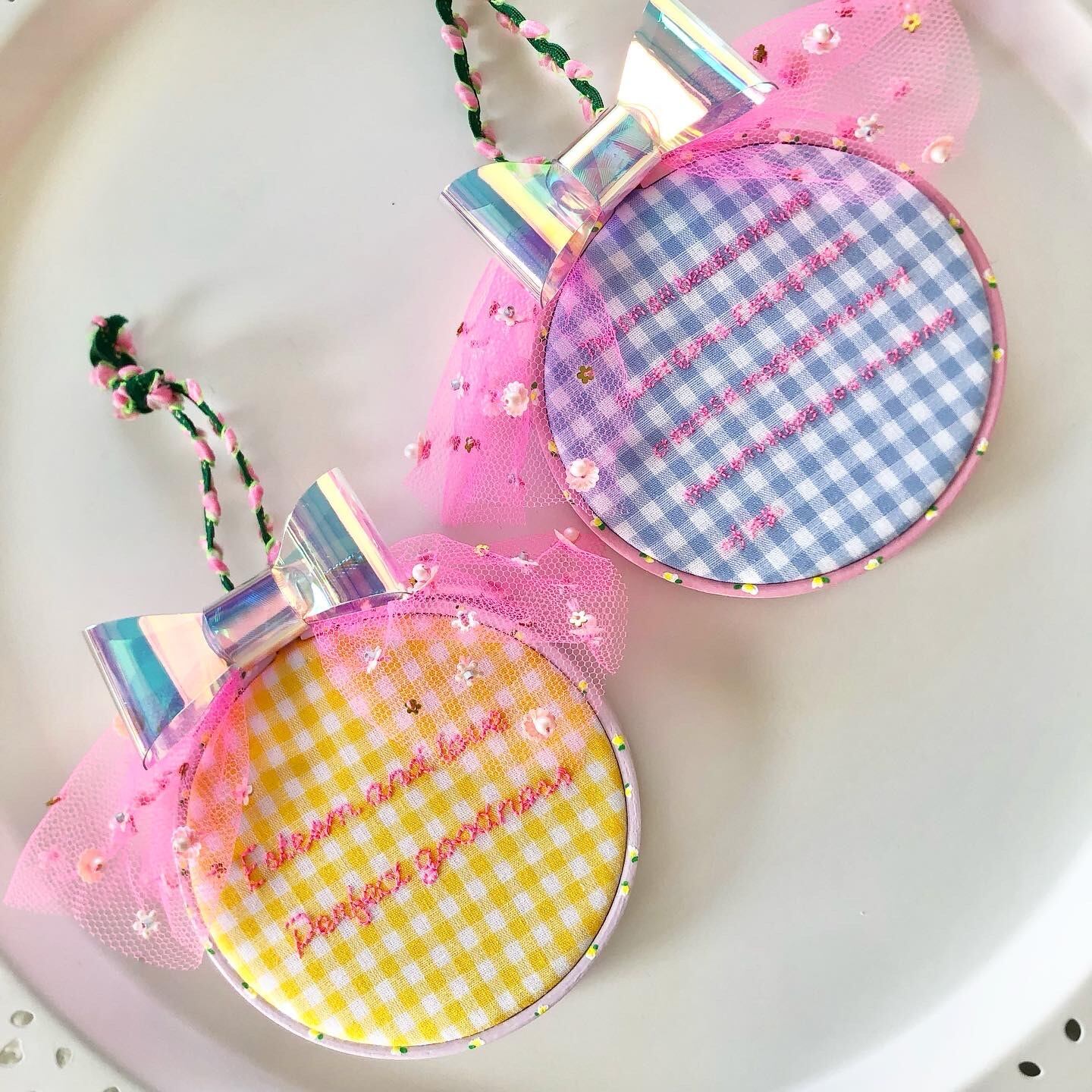 黄色いギンガム生地にはいちごの花言葉「Esteem and love」「Perfect goodness 」を刺繍し、