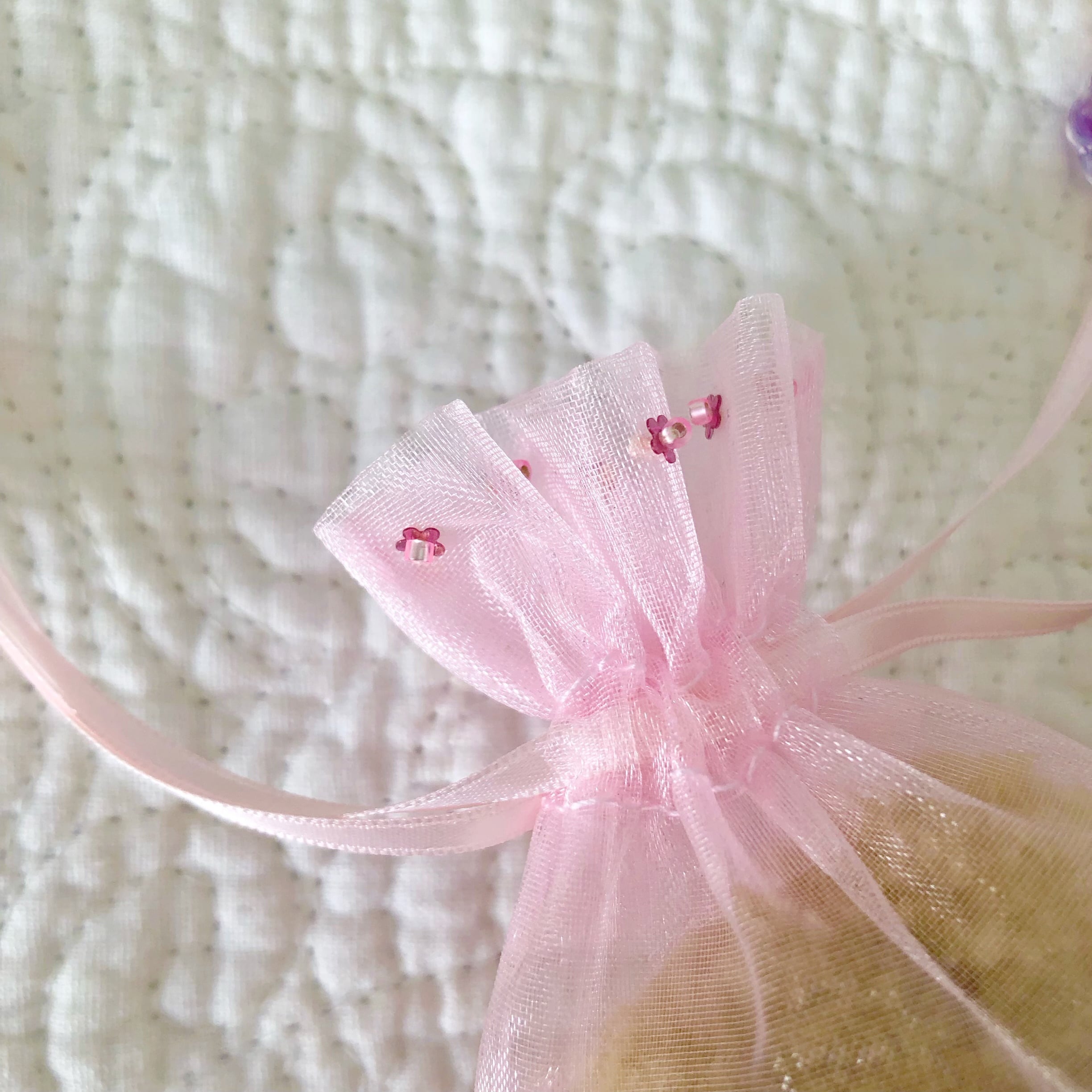 素材:アクリル毛糸、ガラスパール、PVC生地、ガラスビーズ、サテンリボン、フェルト、刺繍糸、スパンコール、オーガンジー巾着、アクリルビーズ